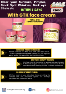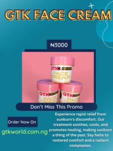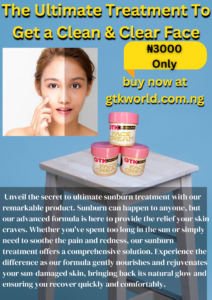 Embrace the sun without worrying about sunburn damage when you have Gtk Face Cream by your side. Our comprehensive sunburn treatment is designed to provide immediate relief from sunburn discomfort while also fostering the skin’s natural healing process. The rich, non-greasy texture absorbs quickly, leaving your skin feeling silky-smooth and protected. With Gtk Face Cream, you can confidently enjoy the outdoors while knowing your skin is well-cared for and supported.